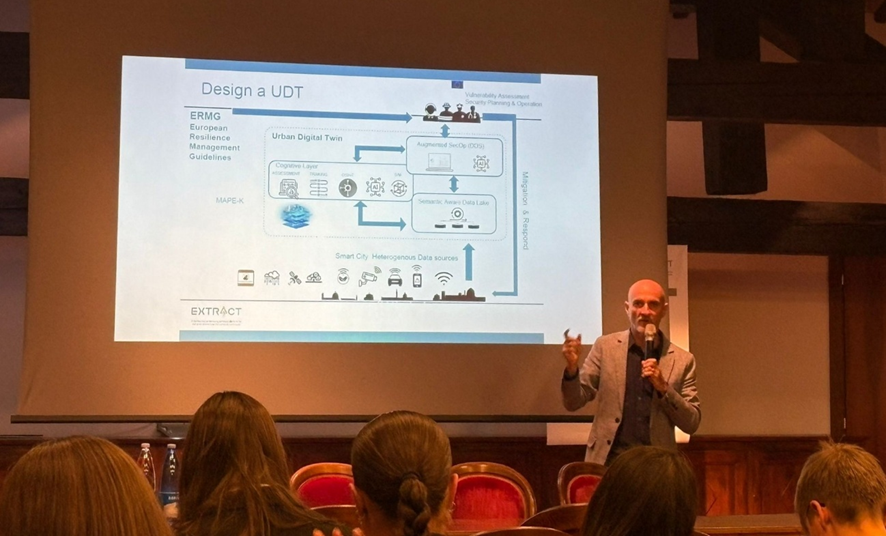 Emmanuelle Bellini (LOGOS-RI) presented the concept of the Urban Digital Twin, using the example of Venice. He demonstrated how a hybrid, self-adaptive digital urban twin can operationalize resilience in smart cities. Currently, the EXTRACT UDT is now in its final development phase and will allow emergency planners, public authorities, and AI systems to interact with urban data more dynamically, improving both real-time response and long-term preparedness.